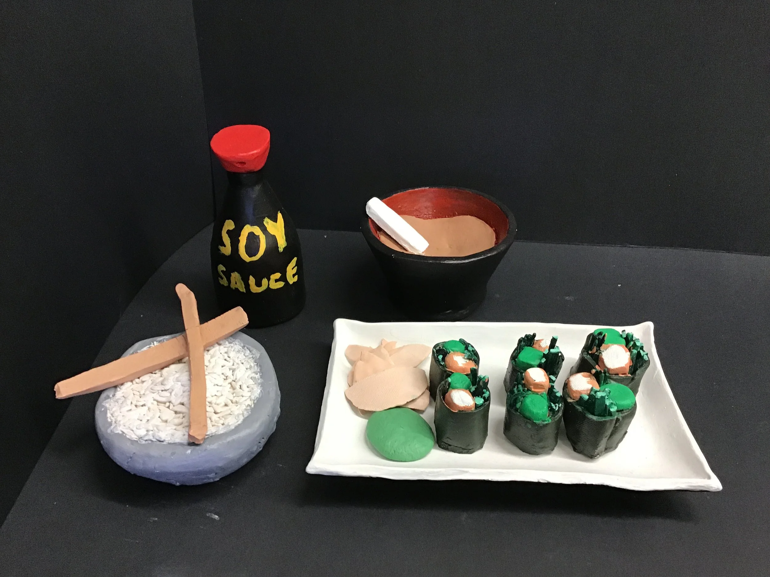 Each group member created one portion of the meal including its plate or container and utensils. They painted the sculptures with acrylic paint and created a menu.